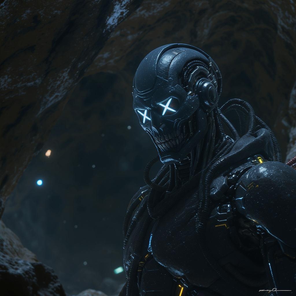c4ttitude as a borg in a mountain cave, displaying trekborg aesthetics, enveloped in moody lighting with a Sci-Fi Star Trek theme. The environment is brought to life with a cinematic feel, showcasing best quality extreme detail in 16k UHD HDR. The scene features glowing LED displays and exhibits a unique, otherworldly vibe. Intricate elements like a cloned face, cross-eyed expression, and mutated features such as extra fingers and hands add to the surreal atmosphere. The cave is transformed into a futuristic setting, free of distractions like text or artifacts, focusing solely on the immersive, high-resolution experience.