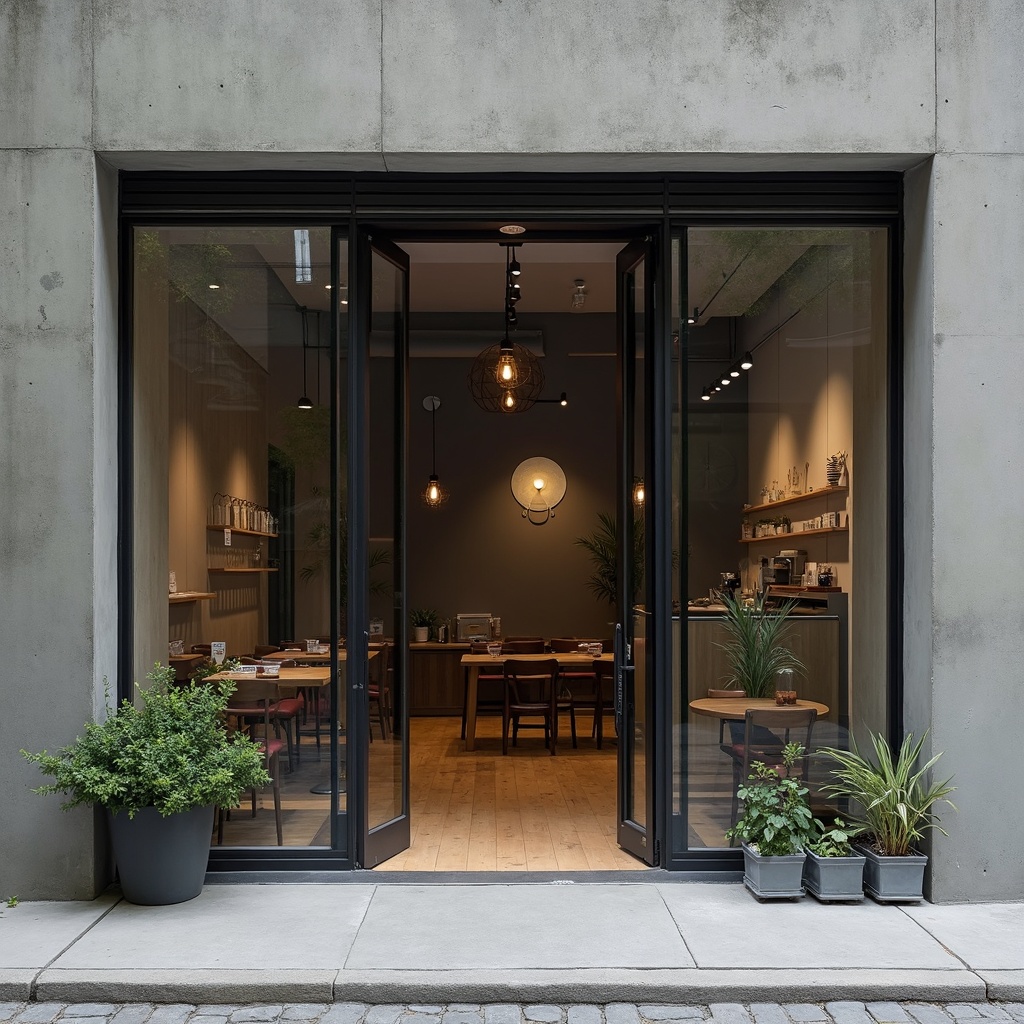 A sleek and contemporary cafe storefront captures attention with its clean lines and understated elegance. The facade features large glass windows framed by steel, allowing natural light to flood the interior, revealing minimalist furnishings and modern decor. Smooth concrete walls and a simple, yet inviting, wooden door contribute to the overall sharp aesthetic. Potted greenery adds a touch of nature, contrasting with the industrial elements, as a stylish, minimal sign proudly displays the cafe’s name above the entrance. The scene conveys a sense of tranquility and sophistication, inviting passersby to step inside for a moment of calm amidst the urban landscape.