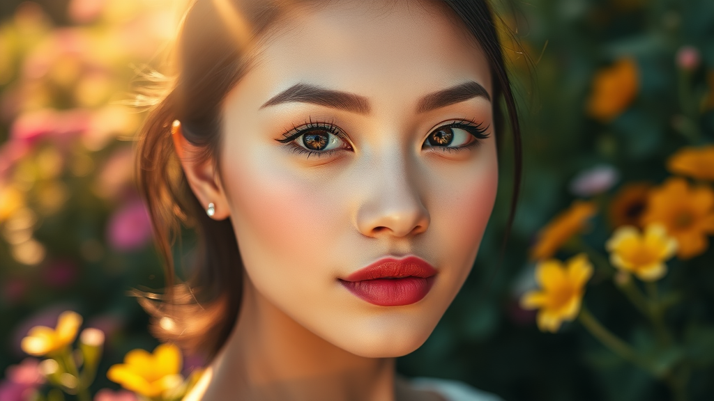 Captivating 8K HDR professional photography of a person posing amidst a vibrant flower garden during the soft morning light. The background features a gentle blur with exquisite bokeh effects, enhancing the sharp focus on the subject's high detailed features. Their skin radiates natural beauty, with clear, expressive eyes and carefully detailed pupils. Lip gloss adds a subtle sheen to their lips, with a touch of blush highlighting the cheeks. Delicate small earrings adorn their ears, adding a hint of elegance. The overall scene evokes serenity and charm, seamlessly blending the lush outdoor setting with the intricacies of human beauty. The essence of artistry is maintained without resorting to simplistic or low-quality elements.
