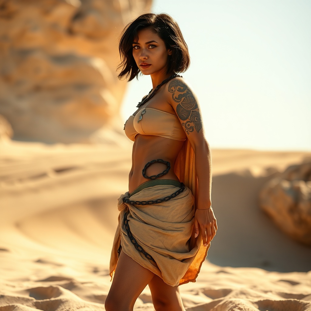 captivating Mediterranean woman, once a servant in ancient Rome, stands full-bodied in the sun's embrace, her athletic silhouette defined by the light's gentle touch; short, lustrous black hair frames her face, shimmering under the sun's rays. Her feet rest delicately on warm, sunlit sand, displaying an intricate belly piercing that catches the eye. A sprawling, ornate tattoo adorns her side, a testament to her journey, partially visible beneath a slightly worn Roman robe that clings to her form with elegance. Around her neck, a bold leather choker adds a touch of defiant grace, while a weathered chain encircles her ankle, a relic of past bondage, now softened by time and the elements.