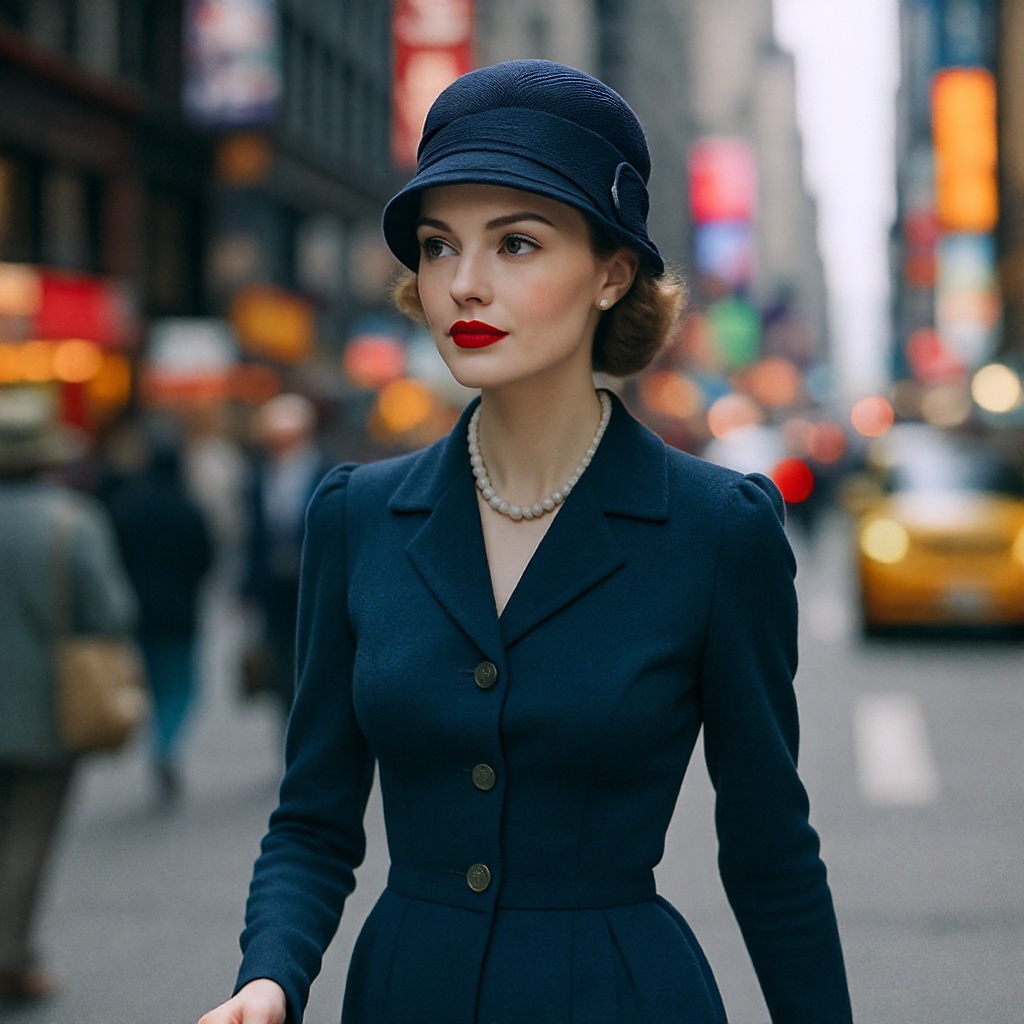 In this captivating photograph, we glimpse a 1930s female influencer amidst her journey, set against the vibrant backdrop of New York City’s streets. She embodies elegance and grace in a form-fitting navy dress paired with an exquisitely styled cloche hat, her striking red lipstick adding a touch of glamour. Captured with a Canon EOS-1D X Mark III camera and a 50mm prime lens, the image boasts exceptional clarity and sharpness. The aperture is set at f/2.8 to achieve a dreamy bokeh effect that highlights the subject against the city's energetic blur, all while preserving enough depth to reveal the lively urban scene. An ISO setting of 400 ensures the rich, vivid colors of the surroundings are retained, with a shutter speed of 1/250 sec freezing her poised walk. Presented in a timeless 3:2 aspect ratio, the photograph exudes a classic allure. The background hums with blurred figures and cars, encapsulating the essence of city life, yet the subject’s assured presence commands the viewer’s focus, encapsulating the spirit of a 1930s influencer leaving an indelible mark with her style and sophistication.