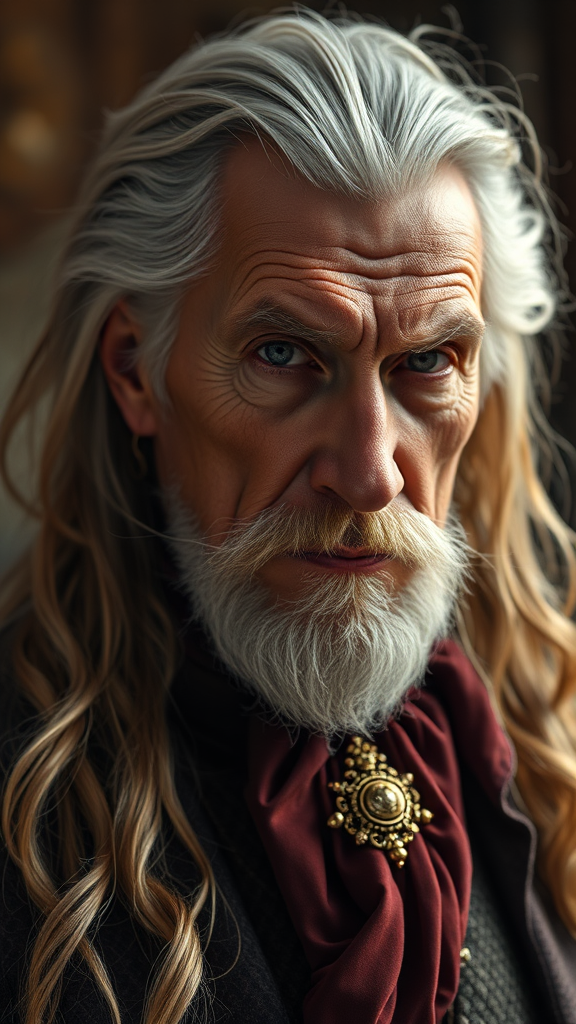 Captivating portrait of an aged superhero gentleman, extremely realistic, drawing inspiration from Zeiss and Leica photography, captured by the lens of Martin Schoeller, featuring astonishing details and Rembrandt-style lighting. He has long, flowing hair adorned with intricate ornaments. The scene is reminiscent of the artistic styles of Artgerm and WLOP, embodied in a professional studio environment with a dewy glow makeup enhancing his features.