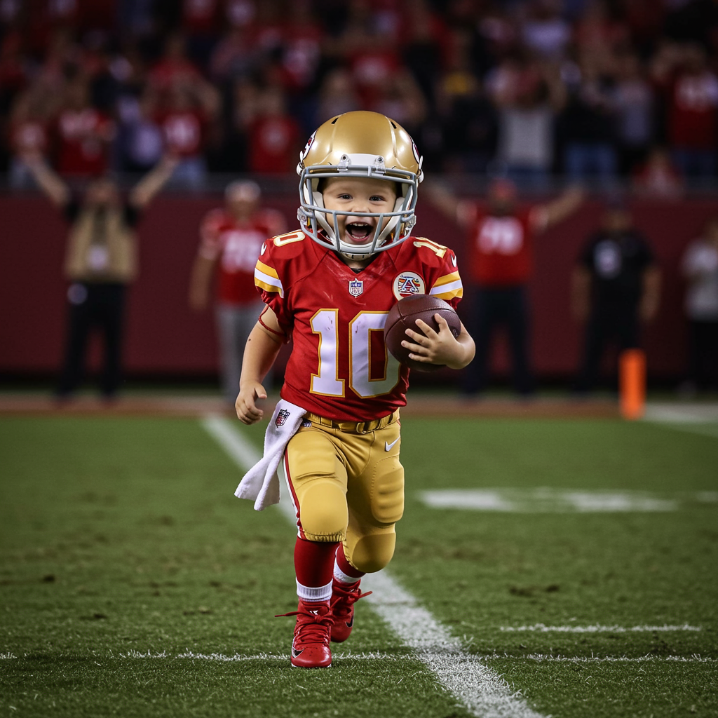 In this captivating scene, a toddler resembling Taylor Swift takes the spotlight as an American football player, donned in a vibrant red and gold Kansas City uniform and helmet. With youthful exuberance, the toddler is captured mid-action, joyfully running with a football, on the brink of scoring a touchdown. The atmosphere is electric with celebration, as joy and excitement radiate from the child. The dramatic lighting adds intensity to this dynamic pose, captured in hyper-realistic detail as a professional shot on a Canon EOS-1D X Mark III, emphasizing the emotion and thrill of the moment.