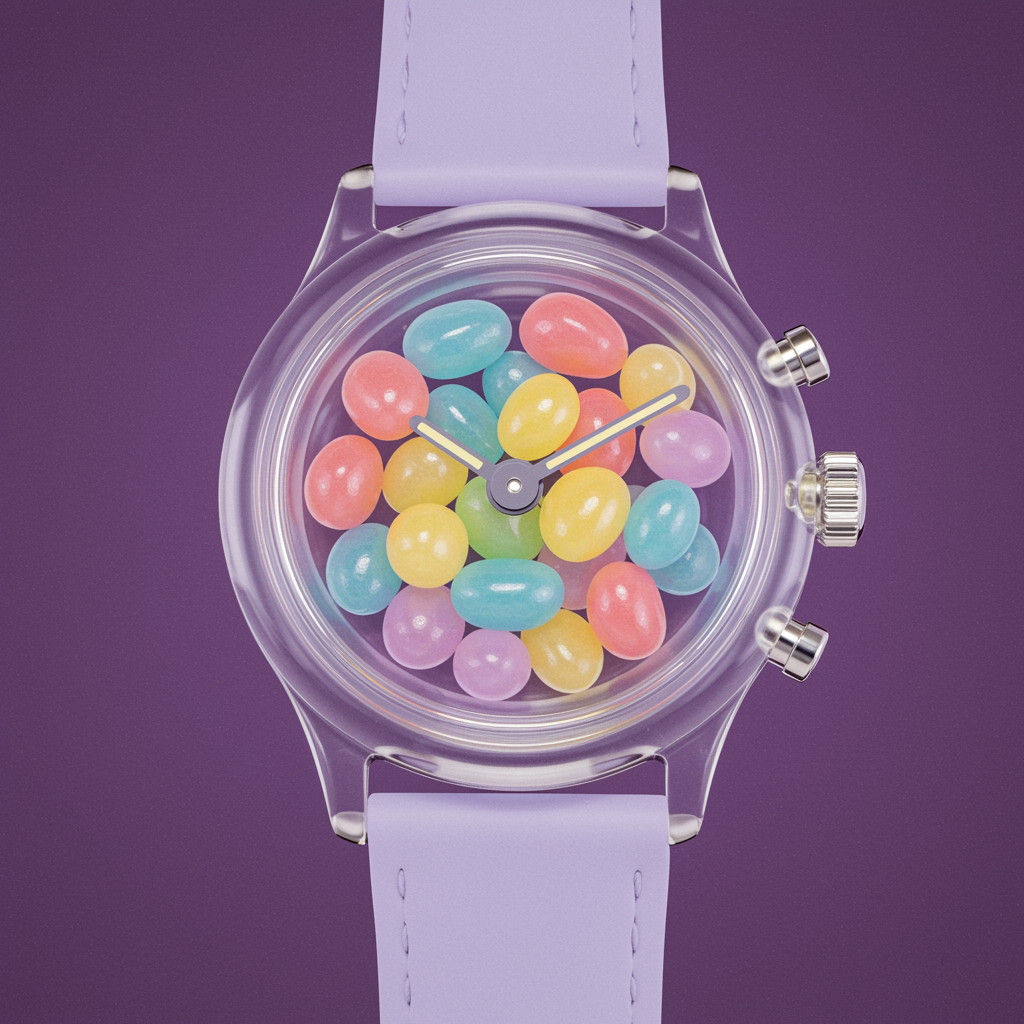 View this AI-generated image featuring capture a top down cinematic fine art photo of a professional studio setting showcasing an inside visible transparent watch crafted from translucent glass the watch is filled with an array of colorful mini jelly beans each reflecting a high refractive index the
