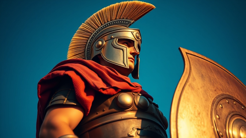 Capture an extreme low angle shot of a Roman legionary poised and ready, his helmet gleaming under the early morning sun as he stands in full armor. Anticipation is etched into his stance as he awaits the signal to commence the march. The rugged texture of his shield and the intricate details of his armor are emphasized in the warm light, creating a powerful contrast against the deep blue sky. Shot with a Canon EOS 90D at 35 mm, in a vertical aspect ratio to accentuate the towering presence of the warrior.