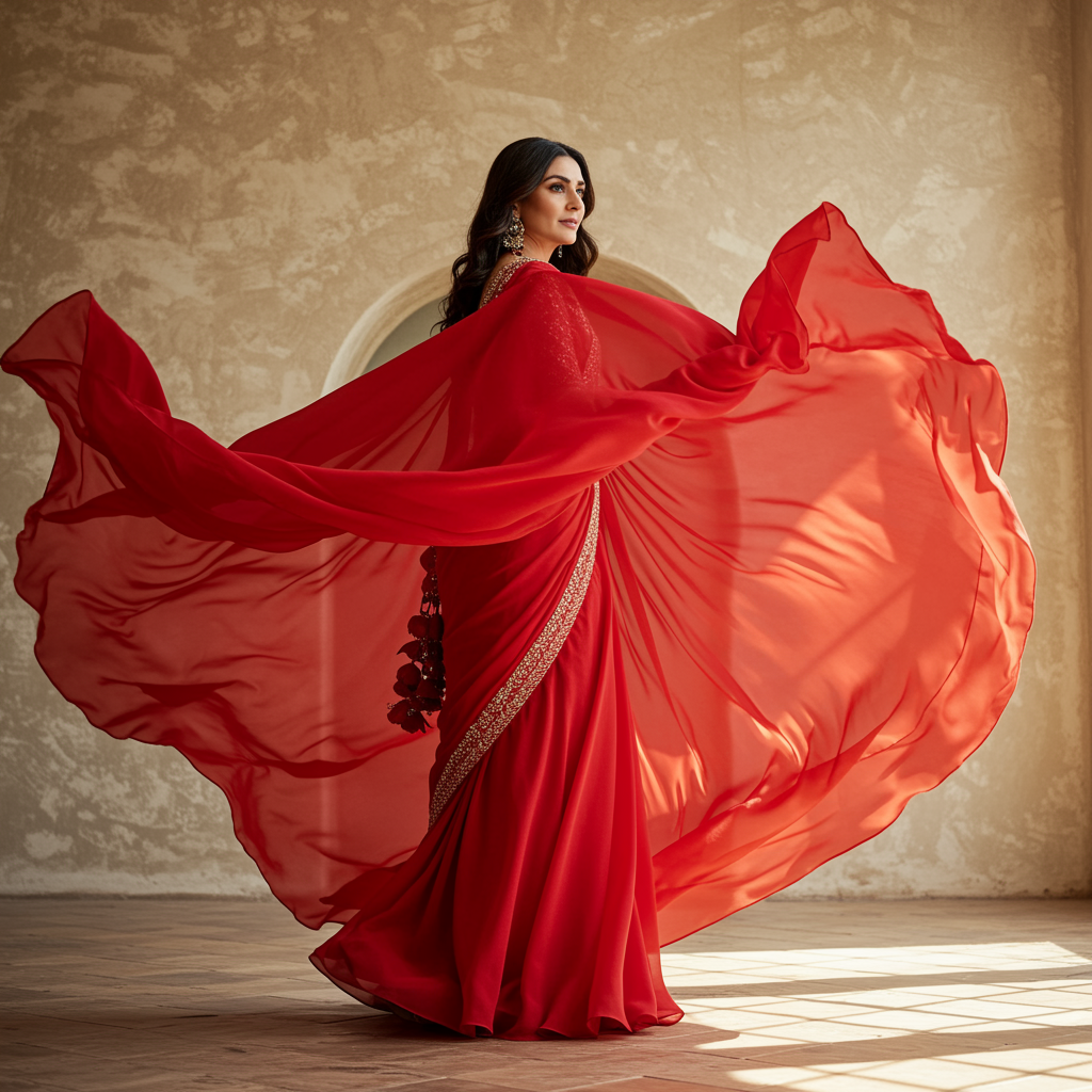 Capture a fashion photograph inspired by a "bug's-eye view" featuring an elegant 45-year-old Indian woman in a stunning, flowing red traditional Saree. The fabric cascades outward dynamically, creating a captivating and dramatic visual. The shot is a full body capture from a low vantage point, presenting a side view, with the camera angled steeply upward from the floor. Her head is in the frame, emphasizing the grandeur of the Saree's movement and the striking perspective from below. The scene conveys grace, beauty, and cultural richness.