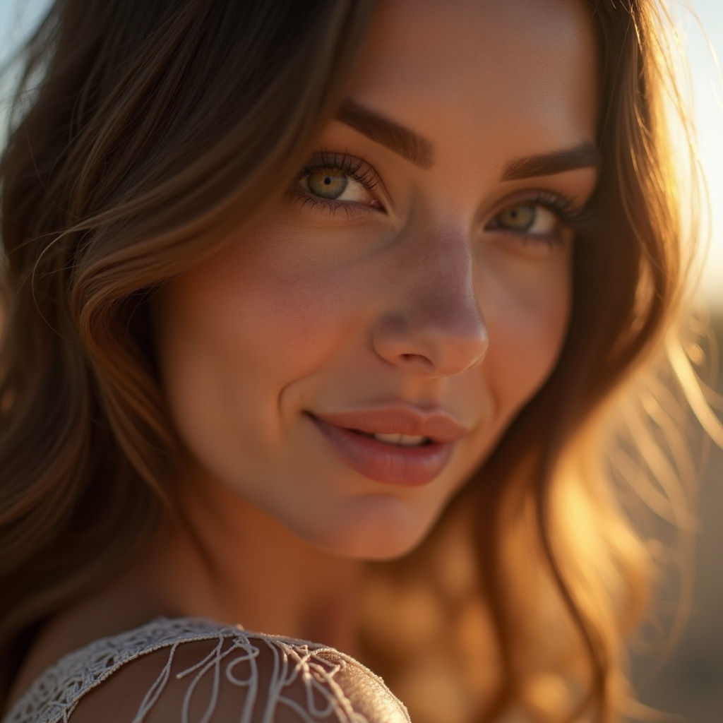 Capture the essence of modern photography with this close-up portrait of an enchanting woman. Harnessing the power of the Sony A7R IV's 61-megapixel full-frame sensor, this image unveils remarkable detail that captivates the viewer. The Sony FE 85mm f/1.4 GM lens enriches the composition with exquisite depth of field and luxurious, smooth bokeh. Set at ISO 100, the camera's shutter speed at 1/250, and an aperture of f/1.4, the photo achieves a harmonious blend of perfect lighting and exceptional detail. The resulting ultra-high-resolution portrait celebrates the artistry of photography and the enduring allure of its subject, enhanced by the subtle play of sun rays and delicate reflections.