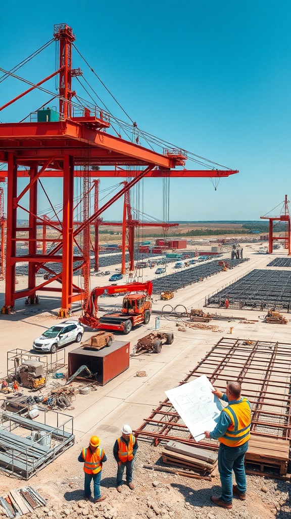 Capture a series of photographs showcasing the development of the dry port in Drogobich, highlighting the bustling construction activity with workers in safety gear operating heavy machinery, towering cranes lifting steel beams, and engineers reviewing blueprints amidst the dynamic site; incorporate creative angles such as aerial drone shots that emphasize the scale of the project and detailed close-ups of workers' hands embodying teamwork and precision, while maintaining focus on the integration of modern infrastructure into the surrounding landscape, with the framework of new warehouses and loading docks taking shape under a clear blue sky.