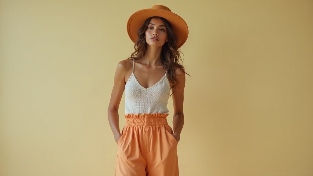 The scene captures a woman exuding an air of confidence as she stands with her hands nonchalantly tucked into the pockets of her baggy, summer-inspired attire. Her look channels the essence of 2020 fashion, yet is infused with a nostalgic nod to the 1950s, creating a captivating blend of eras. The retro color palette evokes a sense of timeless elegance, reminiscent of a Hermes advertisement and potentially curated for an official Dior editorial. She is adorned in a stylish wide-brimmed hat, subtly drawing inspiration from the enigmatic aura of Lance Reddick. The photograph, possibly showcased on Instagram or featured in a Vogue France lookbook, titled "Fromme Seele," embodies a refined aesthetic associated with carefree summertime. The composition is thoughtfully minimalist, avoiding any elements of nudity or overly revealing attire, aligning perfectly with contemporary fashion sensibilities while celebrating a vintage charm.