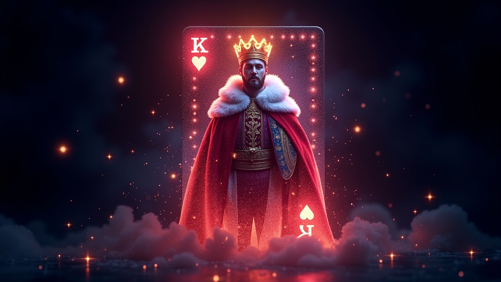 The King of Hearts card morphs into a stunning 3D hologram composed of vibrant cosmic energy. As the regal figure emerges, a cascade of stars and galaxies swirl around him, evoking the sensation of gliding through the universe. His royal attire glistens with intricate celestial motifs, while his crown radiates like a constellation of brilliant stars. The hologram levitates before you, its backdrop continuously transitioning through mesmerizing cosmic landscapes, from radiant nebulae to enigmatic black holes. Ideal for space-inspired gatherings, sci-fi conventions, or cutting-edge tech exhibitions.