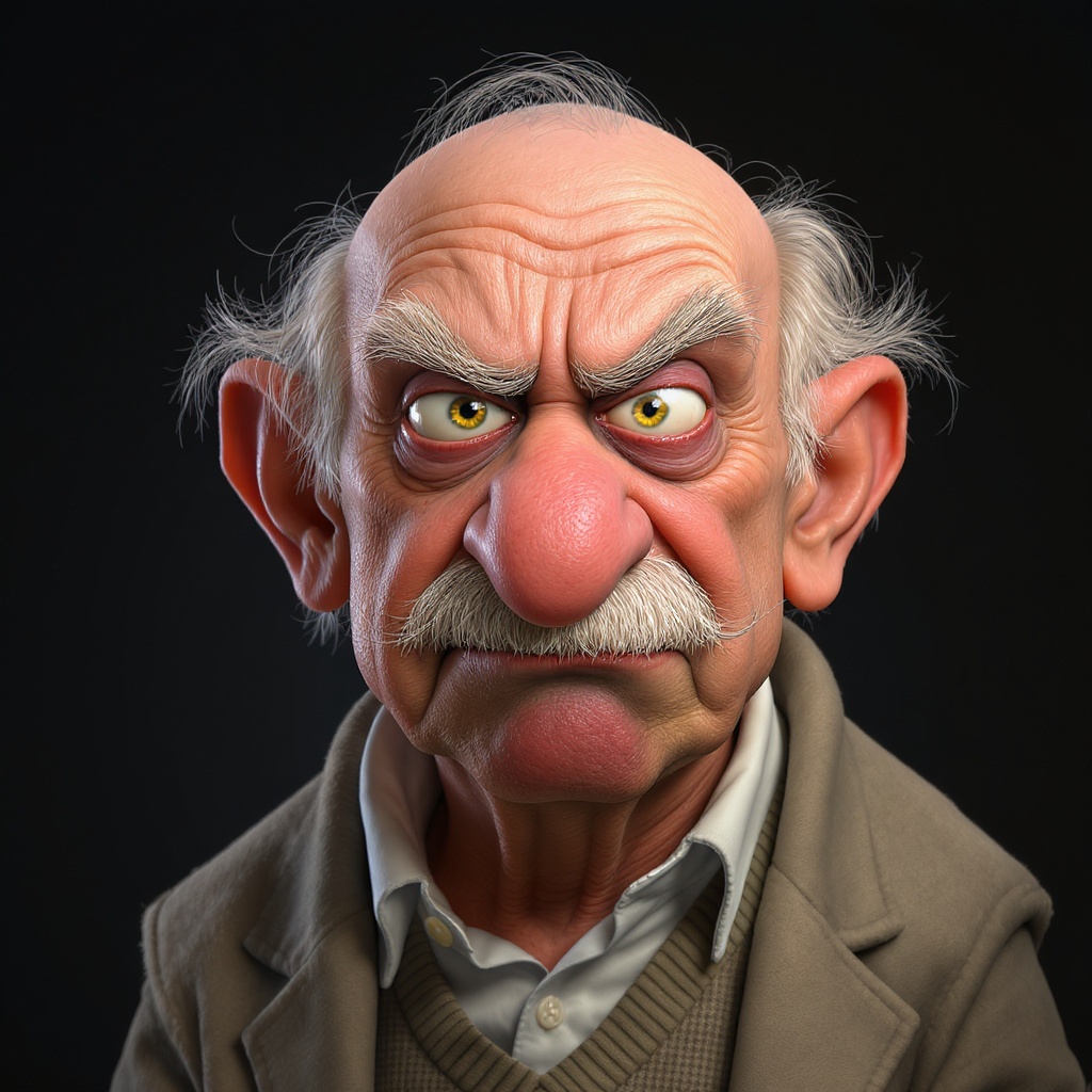 View this AI-generated image featuring an expressive caricature of a seemingly mischievous irritated elderly gentleman with deep wrinkles portrayed in a pixar inspired cartoon art style this highly detailed and intricate portrait captures his charm with sharp focus reminiscent of studio photography