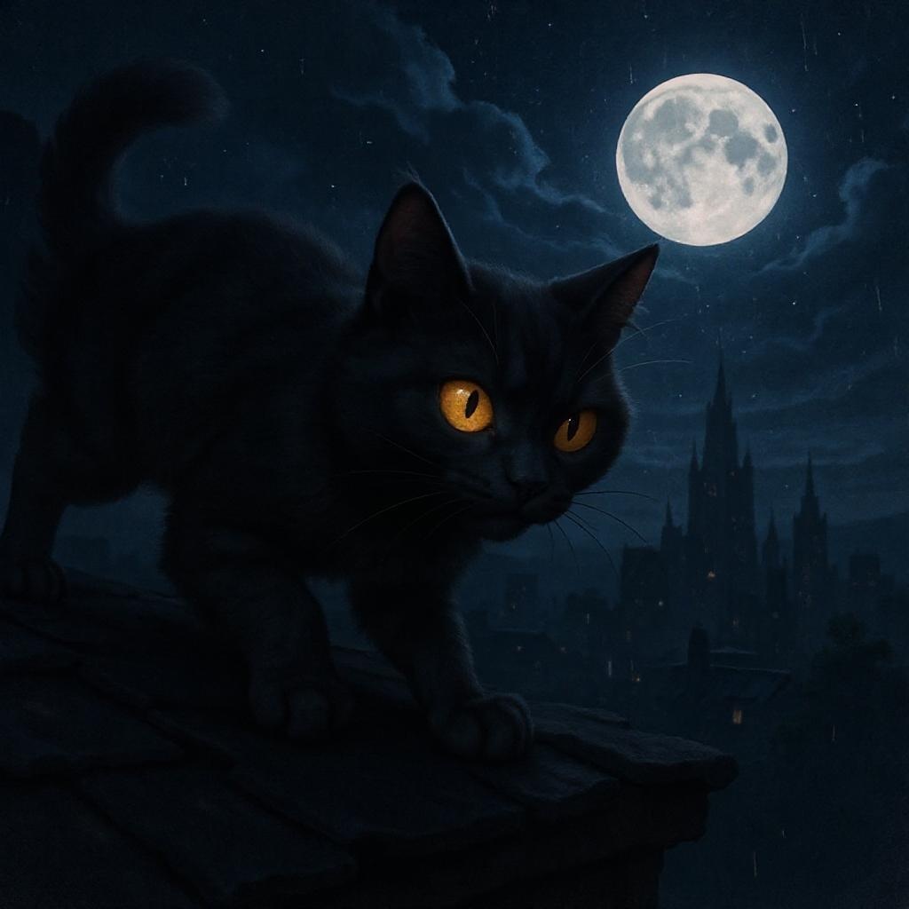 View this AI-generated image featuring a clever cat with an air of mystery prowls the moonlit rooftops its eyes gleaming with curiosity and wisdom as it silently observes the world below. Created using advanced AI technology, this image showcases creative visuals, AI artwork. Perfect for creative pr