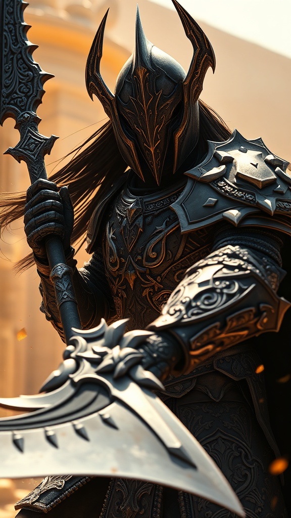 A Pathfinder character inspired by Arthas from WarCraft, a vampire knight wielding a war scythe, clad in intricately carved full-plate armor. His helmet, devoid of a visor, allows his long flowing hair to cascade out as he attacks. Sharp fangs glint in the sunlight, creating a striking contrast with his dark, foreboding presence. Set against the sunlit, ancient backdrop of Egypt, this scene merges epic and dark fantasy elements. The hyper-realistic, cinematic lighting accentuates the realistic textures and intricate details of the armor. The overall design captures a dramatic, photorealistic essence in a 9:16 aspect ratio, adding a touch of creative flair to the core concept.