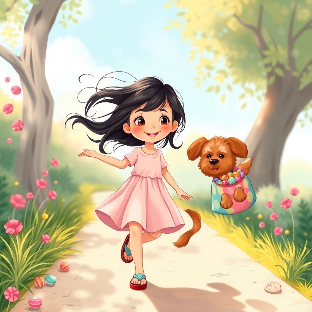 A whimsical children's book illustration featuring a young girl with flowing black hair, adorned in a light pink dress and charming sandals. She's joyfully strolling along a sunlit path with her playful pet dog, who's sporting a coat of vibrant brown fur. In one hand, she clutches a colorful bag overflowing with assorted candies. The scene is brought to life with soft pastel hues, creating a dreamy and inviting atmosphere. Her eyes sparkle with adventure as she shares a special bond with her furry companion, exploring a world full of wonder and sweetness.