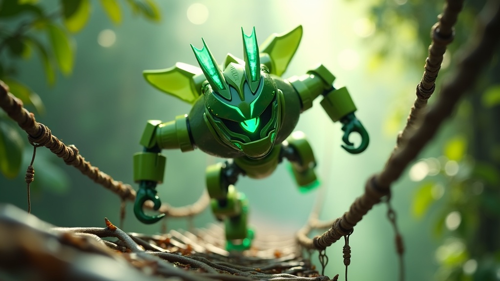 View this AI-generated image featuring cinematic close up rendering of a vibrant green toa of air robot inspired by bionicle featuring glowing emerald eyes and an intricately designed mask the robot is dynamically leaping across hanging bridges in the lush treetop city of le koro surrounded by gentl