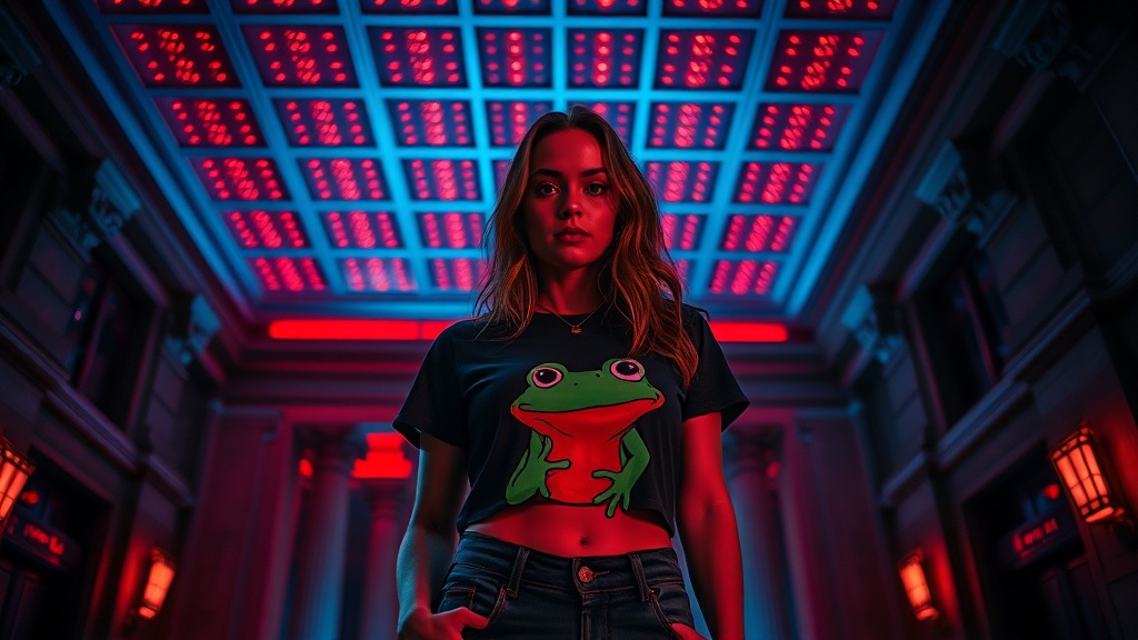 A striking, cinematic image featuring an alluring woman wearing a stylish Frog-themed cropped t-shirt, standing poised in front of the iconic Watergate building. The setting is enveloped in a moody, nightlife atmosphere, with the ceiling adorned in a grid pattern of vibrant red lights. The dramatic scene is further accented by cool blue hues highlighting the walls and support beams, creating an intriguing contrast that enhances the mysterious yet chic vibe. The full-body shot captures her confident stance amidst this captivating fusion of colors and architecture.