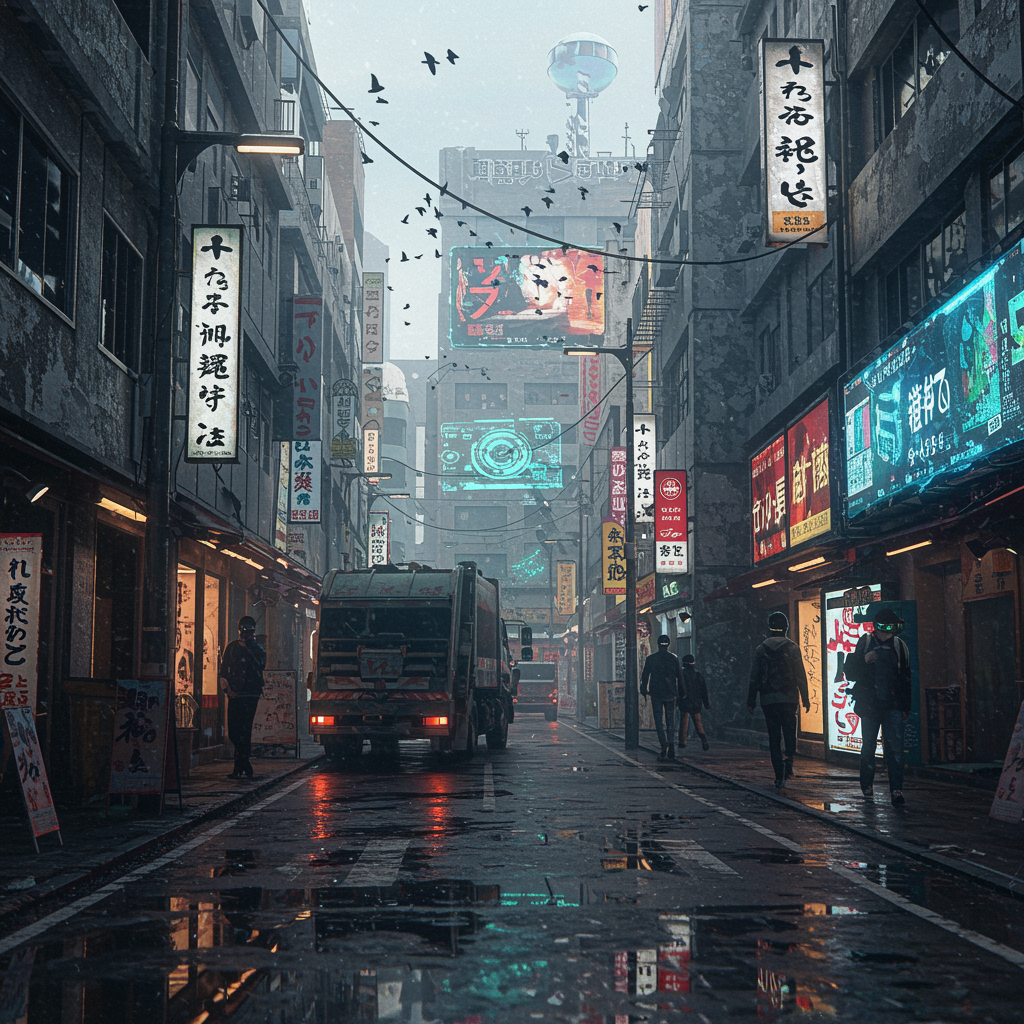 A sprawling cinematic shot captures a street reminiscent of Tokyo, where a tapestry of urban life unfolds. Worn building facades hint at age, juxtaposed by futuristic touches like flickering neon signs and holographic ads casting vibrant reflections onto rain-slick pavement. Above, a flock of birds gracefully slices through the air, momentarily shadowing the scene below. The low hum of a garbage truck punctuates the symphony of the city, rumbling slowly past as pedestrians with augmented reality glasses move purposefully, embodying a future intertwined with the past.