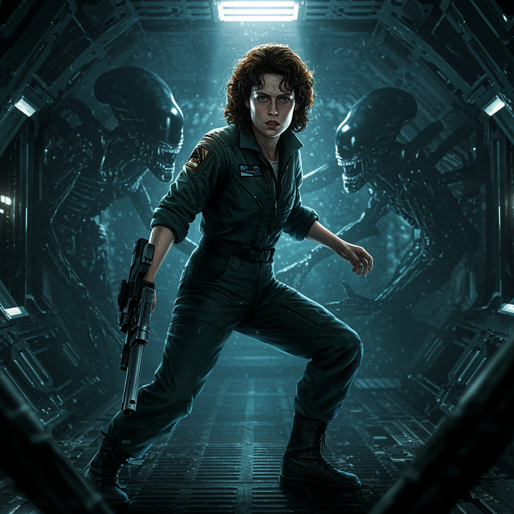 View this AI-generated image featuring a stunning 8k cinematic wallpaper featuring ellen ripley from the alien movie poised in a dynamic action stance amidst a dark atmospheric spaceship interior her determined expression is highlighted by dramatic lighting casting bold shadows that accentuate her f