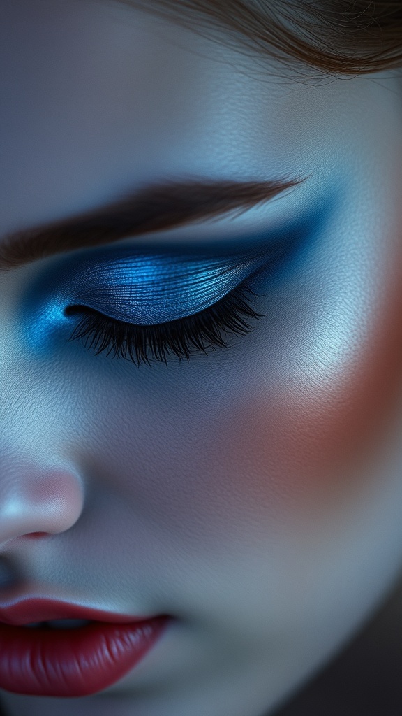 View this AI-generated image featuring a stunning close up of a woman with mesmerizing blue eye shadow blending seamlessly across her eyelids into a smoky dreamy gradient of colors her serene closed eyes rest on a pretty oval face capturing the aesthetic of an official dior editorial trending on pin