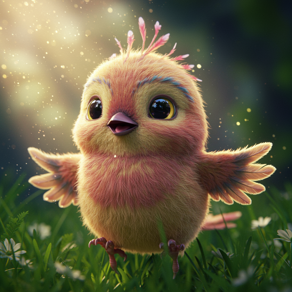 View this AI-generated image featuring a whimsical and enchanting close up of an adorable fantasy bird capturing its innocence and playful nature with ultra detailed features and fairy like illumination the scene is photorealistic bathed in vibrant colors that highlight its unique plumage volumetric