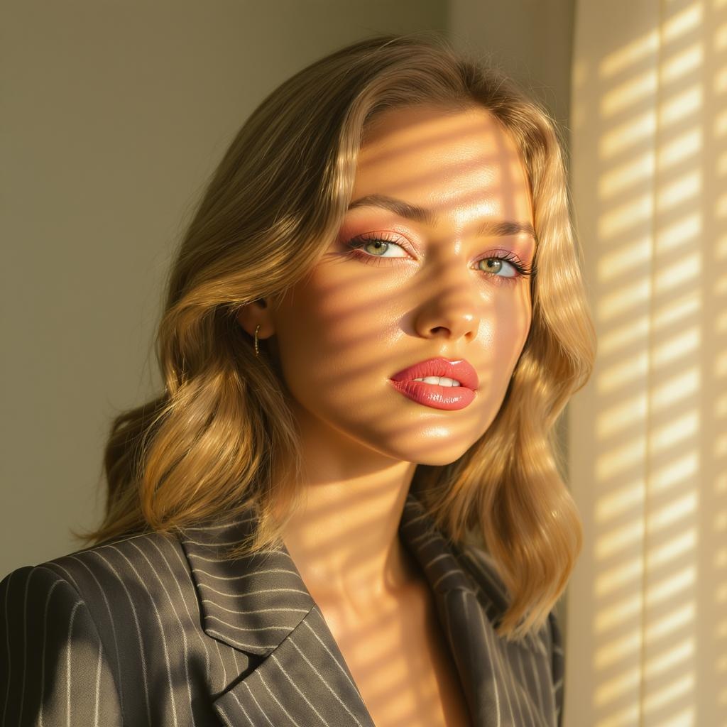 Close-up portrait of a woman bathed in gentle, golden afternoon light filtering through window blinds, casting intricate shadow patterns across her face. She boasts a radiant, natural glow with dewy skin and subtly contoured cheekbones. Her expressive eyes, framed by long lashes, feature a touch of light mauve eyeshadow, while her full lips are adorned with a soft coral hue. The background reveals pale sage walls, complementing the scene's warmth. She wears a charcoal, pinstriped blazer, adding an element of sophistication. The overall aesthetic is hyperrealistic, capturing the minute details like the texture of her skin and the delicate interplay of light and shadow, with a color palette of warm earth tones and gentle pastels.