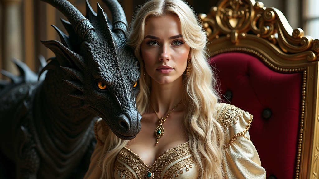 A stunning close-up portrait of a regal queen adorned in an intricate, elegant robe, with a magnificent dragon by her side, situated in the grand throne room of a castle. Her long, flowing blonde hair cascades gracefully, her skin appearing radiant with a hint of subsurface scattering. The setting is bathed in dramatic lighting, highlighting the ultra-detailed, intricate design of her attire. The queen's expression exudes authority and grace, with an air of tranquility. The dragon beside her, majestic and imposing, adds a mythical element to the scene, perfectly complementing the regal ambiance of their surroundings. The focus remains on the beauty and majesty of both the queen and her companion, framed in a scene that conveys power and nobility.