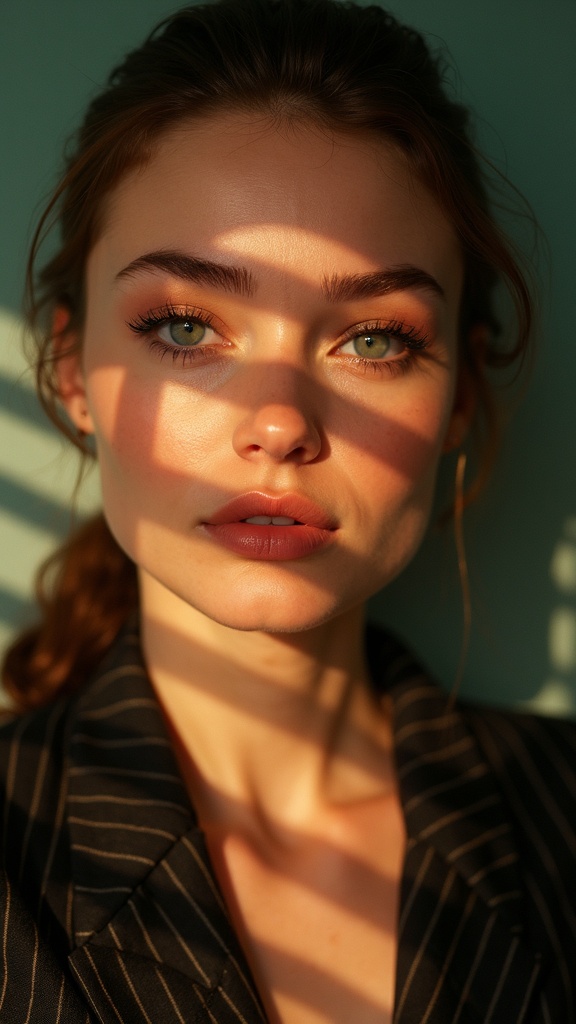 A hyperrealistic close-up portrait of a woman illuminated by warm, golden afternoon light streaming through retro Venetian blinds, casting intricate shadow patterns across her face. The lighting accentuates her natural, radiant complexion, with dewy skin showcasing subtle, realistic textures. Her cheekbones are gently highlighted, and her expressive eyes, framed by long, delicate lashes, feature a hint of pastel eyeshadow that enhances their depth. Her full lips, adorned with a soft coral shade, add warmth to her elegant demeanor. She wears a dark, pinstriped blazer, with detailed precision in the fabric visible, offering a sophisticated, timeless touch. The backdrop is a muted teal wall with a subtle texture that complements the warm, vintage-inspired tones of the scene. The composition blends 1980s-inspired soft synthwave lighting with hyperrealistic rendering, capturing every detail—from the play of light and shadow on her skin to the meticulous weave of her blazer fabric. The aesthetic evokes a nostalgic yet refined mood, merging cinematic glamour with modern hyperrealism.