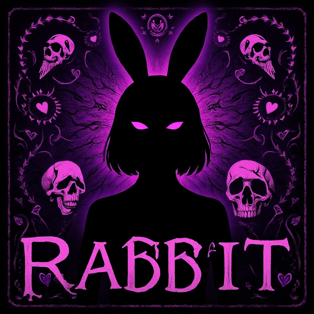 Concert Poster for the band Rabbit featuring one girl with a theme of broken hearts, skulls, purples, pink, and black. Black silhouette art style with UHD, HDR, 8K quality. Model: Dark Sushi Mix, enhanced with unique surreal elements like intricate patterns, abstract distortions, and imaginative forms. Focus on striking visuals with an eerie, dreamy atmosphere. Ensure the design is clean, with no watermarks, logos, or text, and keeps a cohesive style. Avoid elements like low resolution, out-of-frame images, blurry visuals, and poorly drawn figures. Emphasize creativity with subtle enhancements to the core idea.