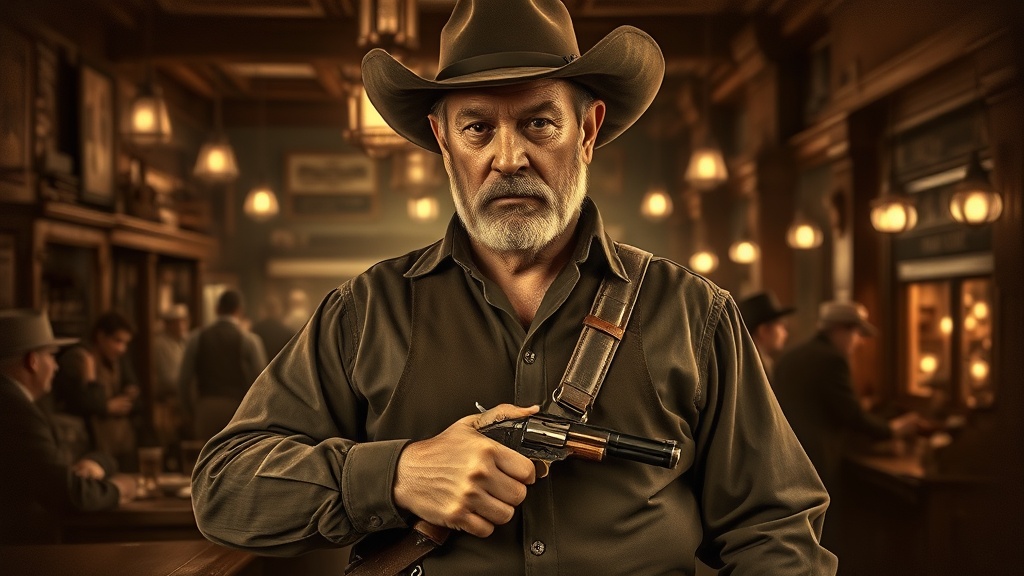 A rugged cowboy with a weathered face stands confidently in a bustling 1880's saloon, his hand resting on a worn leather holster, ready for action. The dimly lit room is filled with the murmur of whispered conversations and the clinking of glasses, reminiscent of a bygone era. The ambiance is captured in sepia tones, giving the scene a timeless, tintype quality. Rich textures of wood and vintage decor add depth, while the gunfighter's determined gaze hints at untold stories of the Wild West.