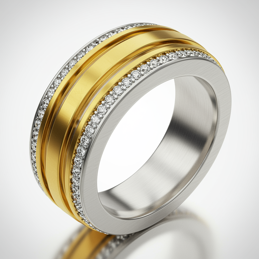 A meticulously crafted ring featuring a harmonious blend of gold and silver, showcasing intricate designs and fine details, expertly modeled and rendered to achieve a photorealistic and lifelike appearance, with subtle creative enhancements that accentuate the elegant symmetry and luxurious finish.