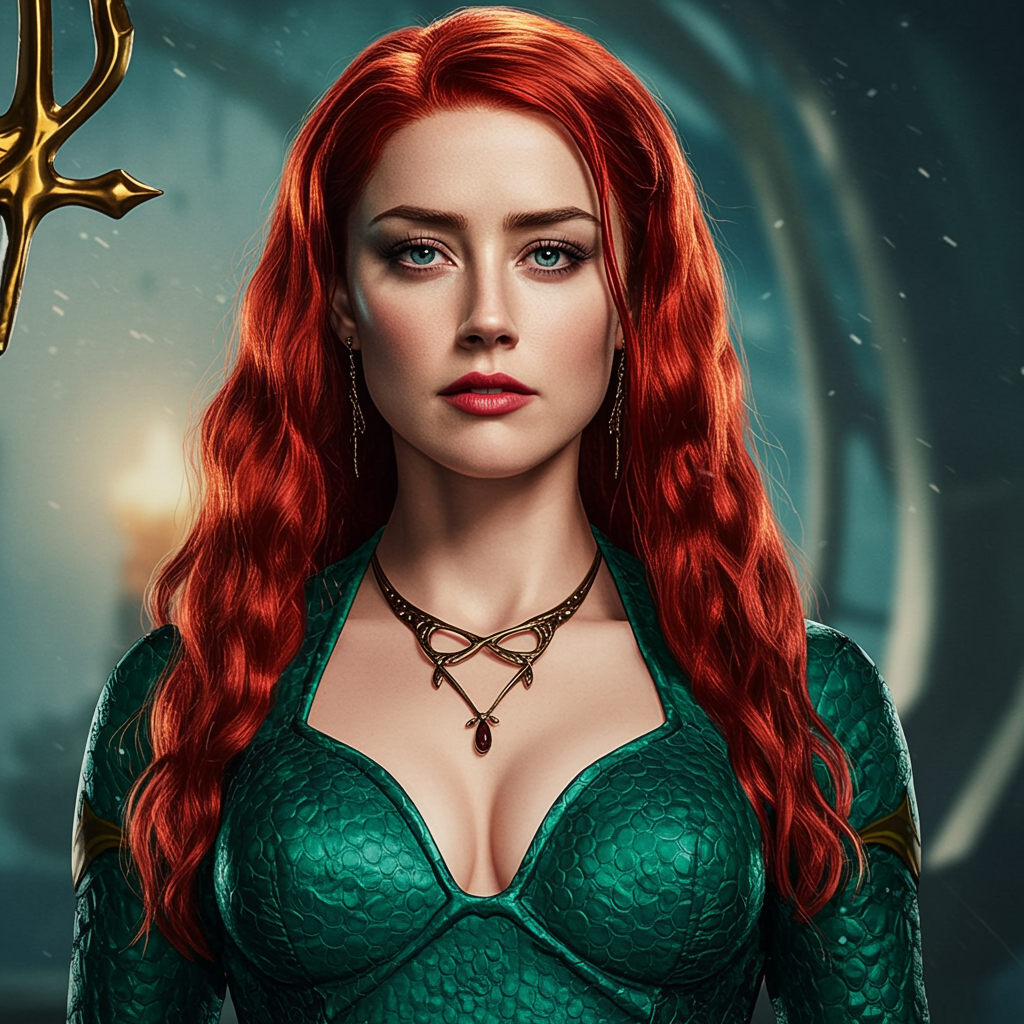Create a realistic photo of Amber Heard dressed as Mera in an 8k resolution. The image features a detailed portrayal of her costume, emphasizing vibrant colors and intricate textures. Her expression is focused and confident, capturing the essence of the character. Her hair is styled in loose waves, reflecting a hint of movement with rich auburn tones. The background is subtly out of focus, drawing attention to her striking appearance. She wears elegant jewelry, including a gothic necklace and earrings, which complement the aquatic theme. The lighting is dynamic, accentuating the sheen of her outfit while casting moody shadows. The overall composition ensures clarity and high quality, maintaining a realistic portrayal without distortions or artifacts.