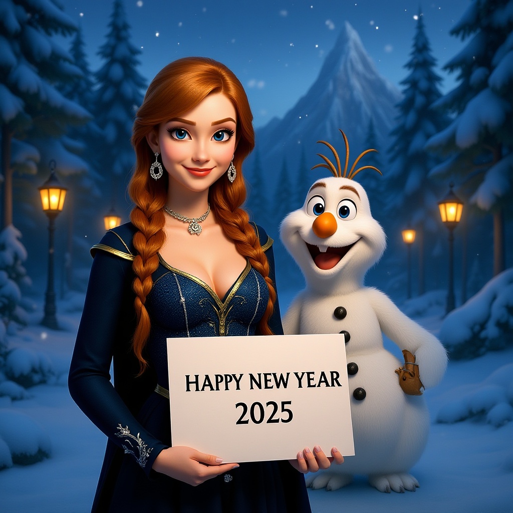 Create a highly realistic and seductive photo of Princess Anna and Olaf from Disney's Frozen, capturing Anna's bold and daring essence while maintaining her spirited and adventurous personality. In the scene, Anna and Olaf hold a sign that reads "Happy New Year 2025" against the enchanting snowy backdrop of Arendelle. The setting features a softly lit winter forest, shimmering snowflakes, and the warm glow of lanterns illuminating the landscape. Anna wears a sophisticated, slightly daring version of her iconic outfit with high-shine modern accents that emphasize her confidence and charm. Her signature pigtails and a subtle reference to the North Mountain are included in the background. Make small creative modifications to enhance the scene while preserving the core concept.