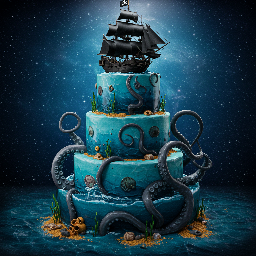Create a visually stunning scene featuring a three-tiered underwater cake at the center, each layer teeming with oceanic elements. On the top tier, a meticulously detailed black pirate ship sails triumphantly, its sails billowing as if caught in a gentle sea breeze. Surrounding the base of the cake, a colossal and intricately rendered Kraken emerges, its tentacles gracefully curling upward, hinting at both mystery and power. The backdrop is a beautifully crafted universe diorama, with stars twinkling against a deep blue cosmos, accentuated by dramatic, ethereal lighting casting intriguing shadows and highlights. The entire scene is depicted with hyperrealism and photorealism, utilizing a finely tuned depth of field to draw the eye to particular details within the composition. Created using Unreal Engine technology, this scene boasts exquisite detail and an 8k resolution, capturing every nuance and texture with striking clarity, presented in a 9:16 aspect ratio for an immersive viewing experience.