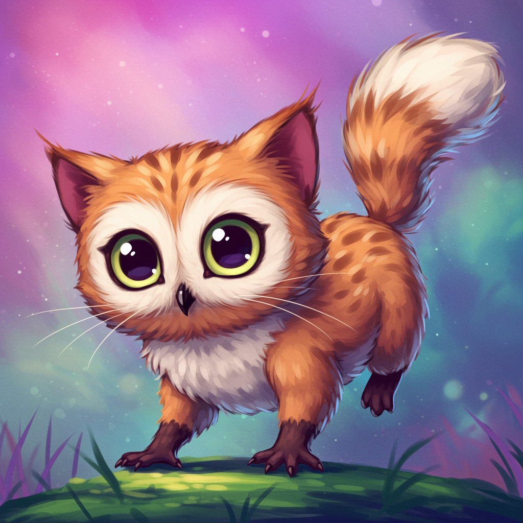 A whimsical creature blending the features of an owl and a cat, showcasing large, expressive eyes and soft, feathery fur, exuding a cute and enchanting aura; concept art in an anime style, portrayed in a vibrant 2D painting with a focus on a dynamic, playful pose; capturing a sense of curiosity and mystery in its demeanor; elongated and graceful body with a fluffy tail, perched elegantly, suggesting movement; the setting is a dreamy, ethereal landscape, enhancing the creature's fantastical nature, with a vivid use of colors and an expressive artistic style.