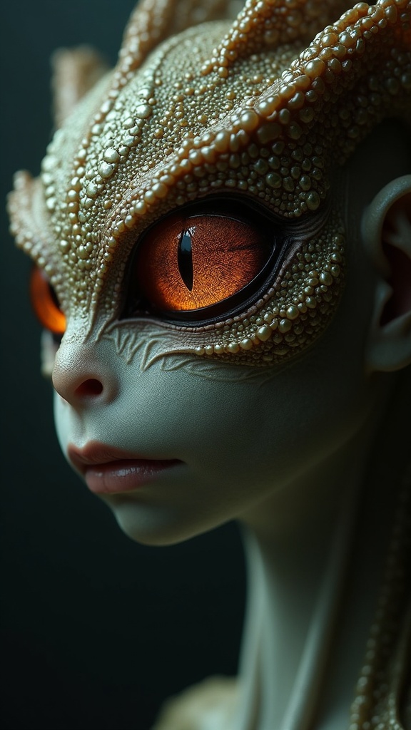 View this AI-generated image featuring a close up portrait of a mythical creature that embodies the essence of wonder exuding a sense of mystery that is heavily exaggerated beyond human form very detailed close up dark amber orange reptilian humanoid eyes its presence is ethereal existing only in th