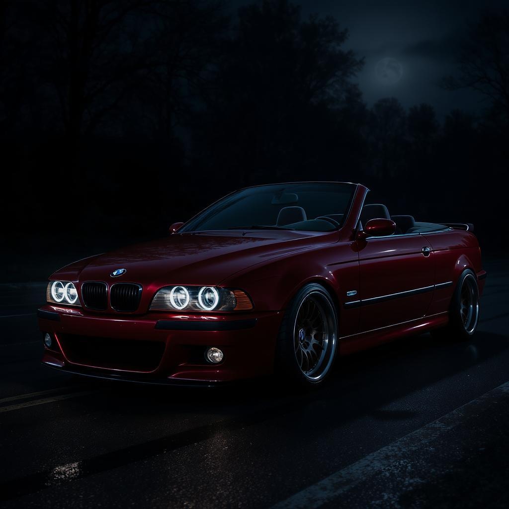 A deep crimson BMW E39 M5 convertible, its sleek body glistening under the moonlight, illuminated by glowing angel eyes that pierce through the dark evening; the scene is cinematic and hyper-realistic, with exquisite detailing captured in 8k resolution, the cool night air whispering around the contours of the car as it sits in dramatic stillness, accentuating its powerful elegance against the shadowy backdrop.