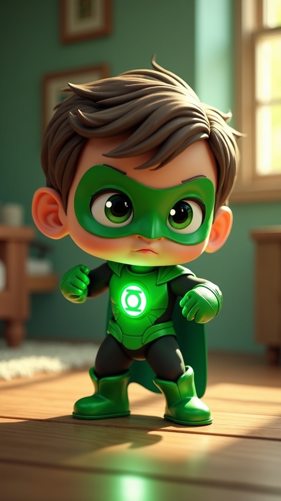 Cute little humanoid Green Lantern, chibi style in an action pose, rendered using Unreal Engine 5. The setting boasts comfortable indoor lighting with a touch of surrealism. Inspired by the character design styles of Mark Redden, Pixar, and Hayao Miyazaki, the digital painting showcases detailed features with an emphasis on charm and expressiveness. Rendered in high-quality using Octane Render, the image is UHD, HDR, and 8K. The character exudes a whimsical yet heroic aura, all while maintaining a sense of playful innocence. Avoiding any imperfections such as disfiguration or awkward anatomy, the depiction is clear with a smooth, polished finish free of any distortions or unwanted elements in the background.