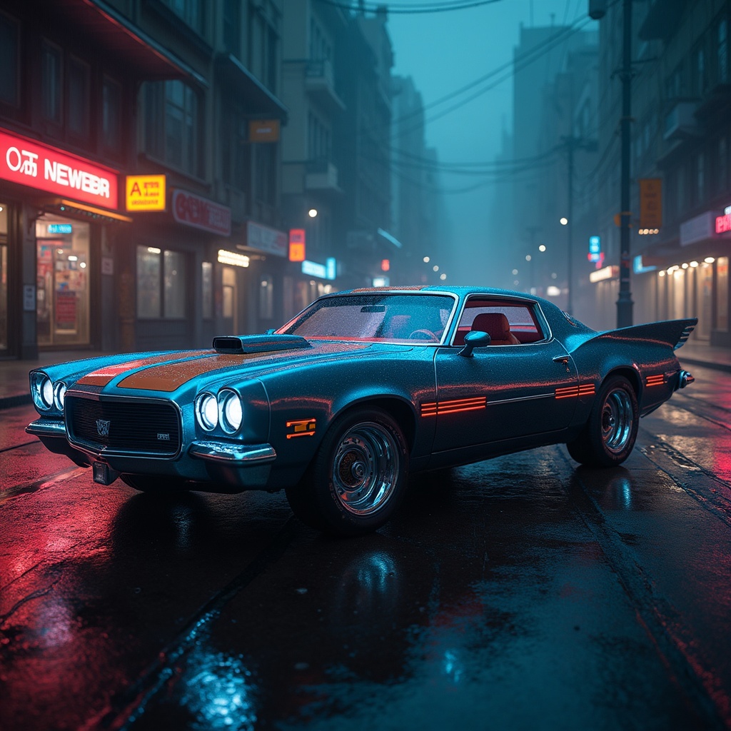 A retro-futuristic cyberpunk car, with sleek chrome fins and neon accents, its body an eccentric amalgamation of 1960s muscle car design and futuristic technology, features holographic touch displays integrated into the dashboard, while its wheels hum with a subtle electric glow, casting pulsating patterns on the rain-soaked streets under the dim, flickering neon lights of a sprawling urban landscape.