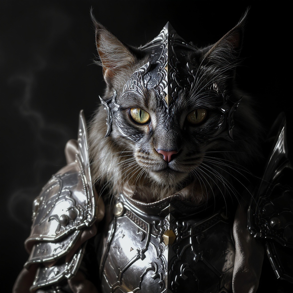 View this AI-generated image featuring dangerhorse feline warrior close up exquisite armor elaborate craftsmanship shimmering silver flowing silk dramatic lighting 4k resolution enhanced with subtle corrections for optimal image quality. Created using advanced AI technology, this image showcases cre