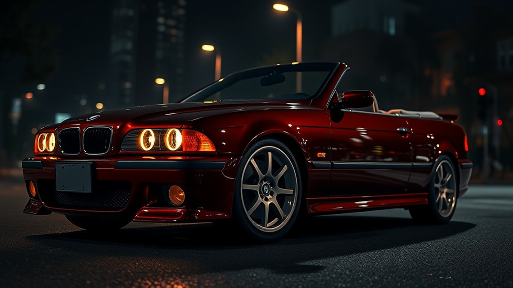 Dark crimson BMW E39 M5 convertible, glowing angel eyes, cinematic allure, ultra-realism, intricate details, 8k resolution, moody night setting, reflections on glossy paint, soft ambient lighting, dynamic shadows, urban backdrop, hints of city lights.