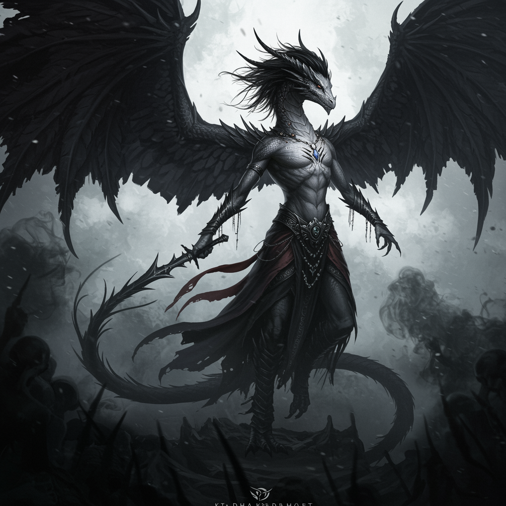 Darkness gracefully envelops a majestic and colossal dragon, adorned with flowing, wind-swept black hair and elaborate scale wings. Its pale, ethereal skin contrasts vibrantly against the swirling spiral of smoke and the ethereal white foggy light that forms the backdrop. Inspired by the artistic genius of Andrei Riabovitchev, JohnnyD, Massimo Caggese, Peter Mohrbacher, this scene merges magic realism with the intricate detail often seen in cinematic dark fantasy. It's a fashion photo shoot captured in the surreal world of Magic: The Gathering, where the dragon strikes a gorgeous, avant-garde pose that reflects a complex narrative. The dramatic lighting and shadows evoke a sense of awe, enhanced by the presence of subtle orthodox symbolism. The piece embodies a maximalist design, rich in detail and texture, echoing the elaborate artistry of Moebius and Arney Freytag. Set in a high-resolution 8k format, this scene is a stunning piece of concept art, enveloping viewers in its ambient, tribal mystique with an edge of ominous intrigue.