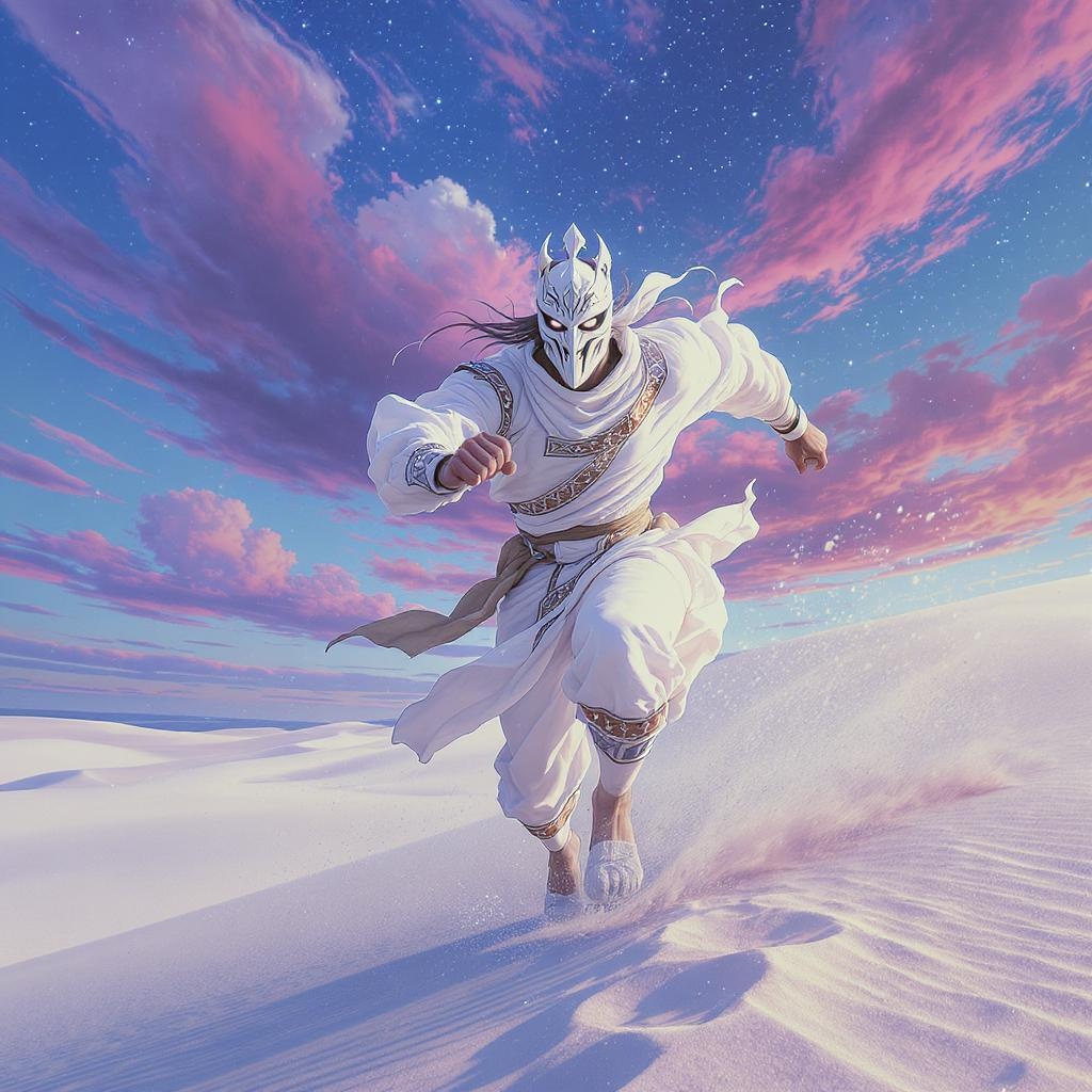 A figure dashes across the crest of a shimmering white sandy dune, capturing attention with piercing eyes directed at the camera. Clad in flowing, oversized white garments adorned with intricate tribal patterns, he exudes an air of mystique. His white tribal mask adds to the enigmatic allure, blending ancient tradition with a futuristic vibe. The scene vibrates with a kaleidoscope of dreamy, bright colors, reminiscent of anime and Studio Ghibli’s whimsical worlds. The expansive sky above is painted with hues of pink, purple, and blue, enhancing the surreal and ethereal atmosphere, as soft winds play with the fabric, creating a dance of shadows and light.