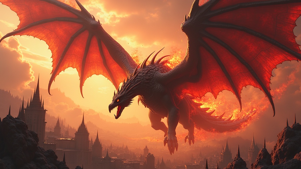 View this AI-generated image featuring a towering deathwing engulfed in swirling flames looms over a sprawling cityscape incandescent tendrils licking the sky crafted with zbrush precision the scene is rich with referential painting techniques featuring jagged spiky mounds that echo its formidable p