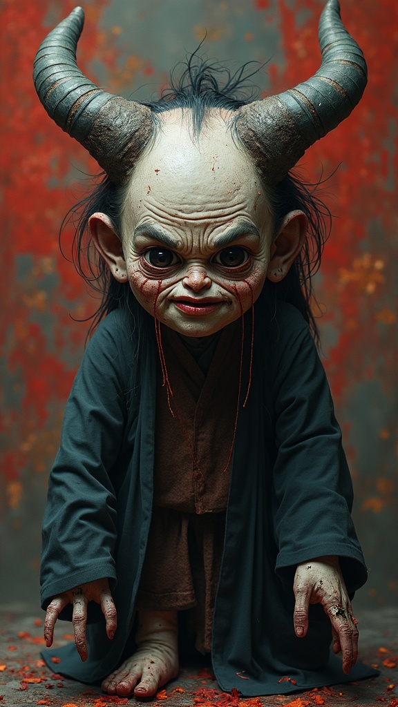 A nightmarish depiction inspired by Japanese Oni culture, showcasing an evil figure with a distorted and haunting appearance. The portrait is highly detailed, vividly capturing the intricacies of the fearsome visage in 8k hyperrealistic quality. The figure is depicted in a mid-shot, 2/3 face angle, with side lighting enhancing the dramatic effect. The background is vibrant and colorful, accentuating the menacing aura. Despite its detailed nature, the image features intentional imperfections such as poorly drawn hands, feet, and face, along with extra limbs and disfigured features. The anatomy is deliberately flawed, with body parts poorly composed or out of frame, creating a sense of disarray. The image includes various anomalies like mismatched eyes, crooked facial features, and unusual body positioning, contributing to its unsettling nature. The overall composition is unbalanced, with a sense of surrealism and nightmarish distortion.