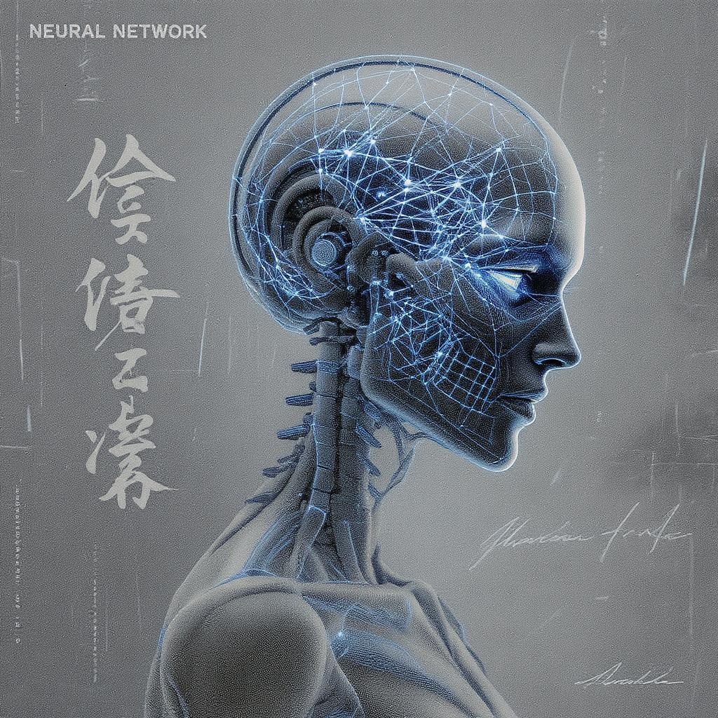 An exquisite depiction of an ethereal neural network entity, showcasing half a face as a robotic skeleton with intricate, stunning facial features. Captured from a 45-degree angle, the artwork combines elegance and futuristic elements, resembling a hologram with electro influences. The piece is rich in maximum details yet features a subtle blur to convey a sense of mystique. Its surface texture appears plastic and slightly grainy, offering a sense of realism. The anatomy includes a delicate balance of form with faint hints of limbs. The piece incorporates indistinct text, a name, and a signature that blend into the background, with a hint of jpeg artifacts, adding a raw, abstract quality.
