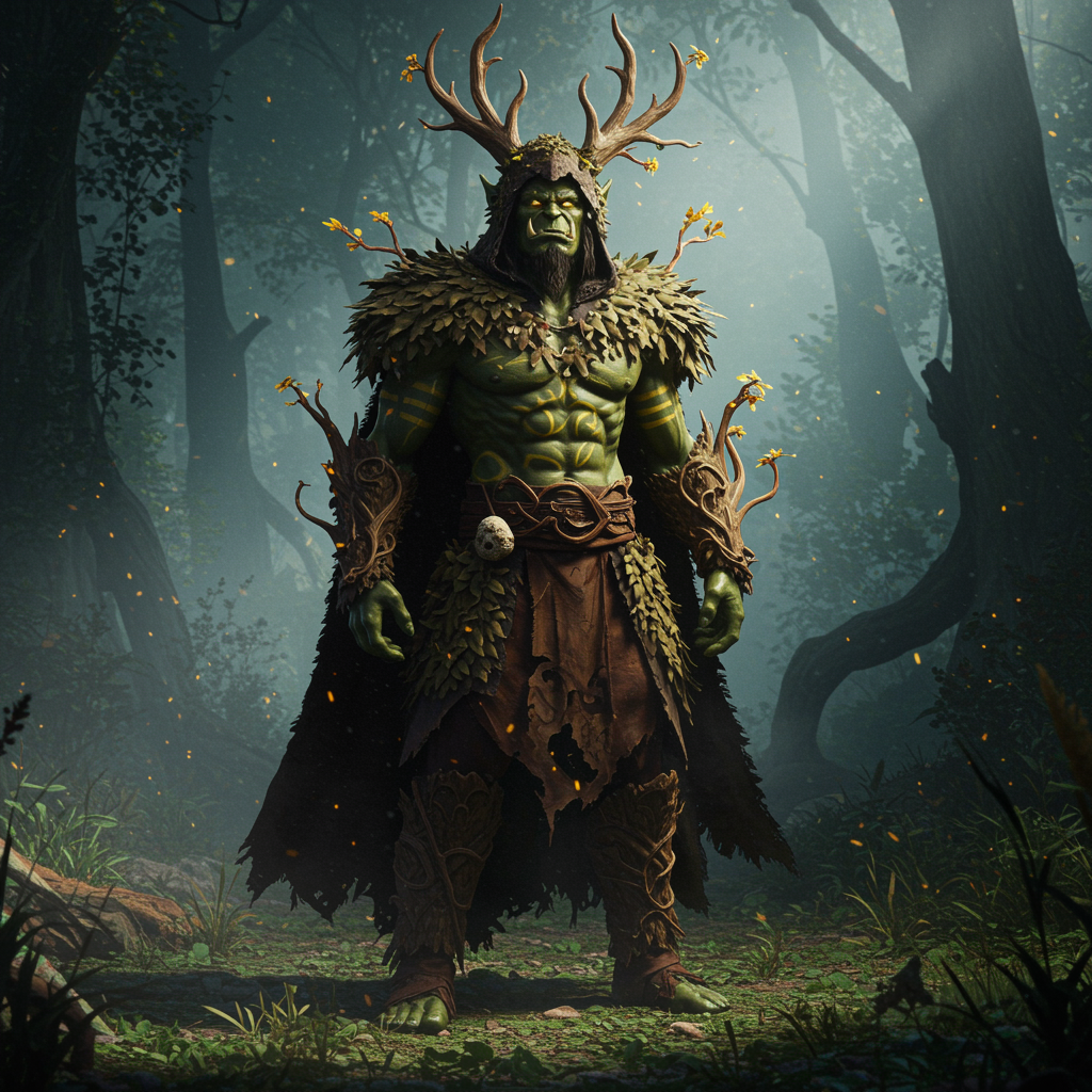 View this AI-generated image featuring an ultra realistic depiction of a male orc druid standing in a mystical forest the orc s rugged green skin is textured with intricate tribal tattoos and he wears a cloak made of intertwined leaves and vines his piercing eyes glow with a deep amber hue reflectin