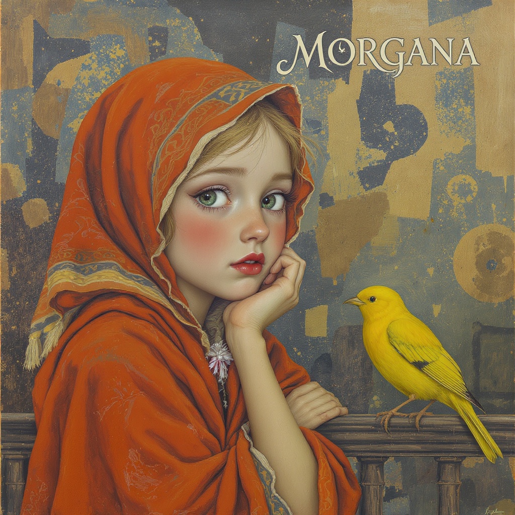 An enchanting depiction showcases a young girl with delicate features and mesmerizing large green eyes, adorned in an intricately patterned orange headscarf and a matching cloak that displays a texture reminiscent of weathered, vintage paint. She rests her chin thoughtfully on her hand, her gaze absorbed by a lively yellow bird perched elegantly on an old wooden railing. The backdrop is a soothing blue-toned textured wall, adorned with abstract and faded shapes, evoking the spirit of an ancient mural. The scene beautifully blends whimsy, nostalgia, and fantasy, with exquisite fine details and a gentle, painterly essence. In the top right corner, the word 'MORGANA' elegantly appears, suggesting the identity or origin of the artwork.