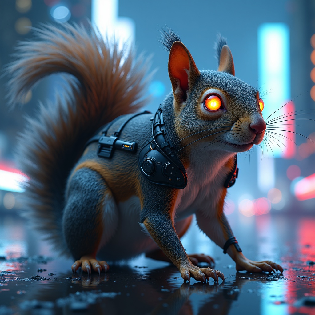View this AI-generated image featuring a photorealistic depiction of a human like squirrel with exaggeratedly large features such as an oversized bushy tail and prominent teeth featuring cyberpunk style glowing eyes and intricate cybernetic enhancements the image is rendered in ultra high detail emp