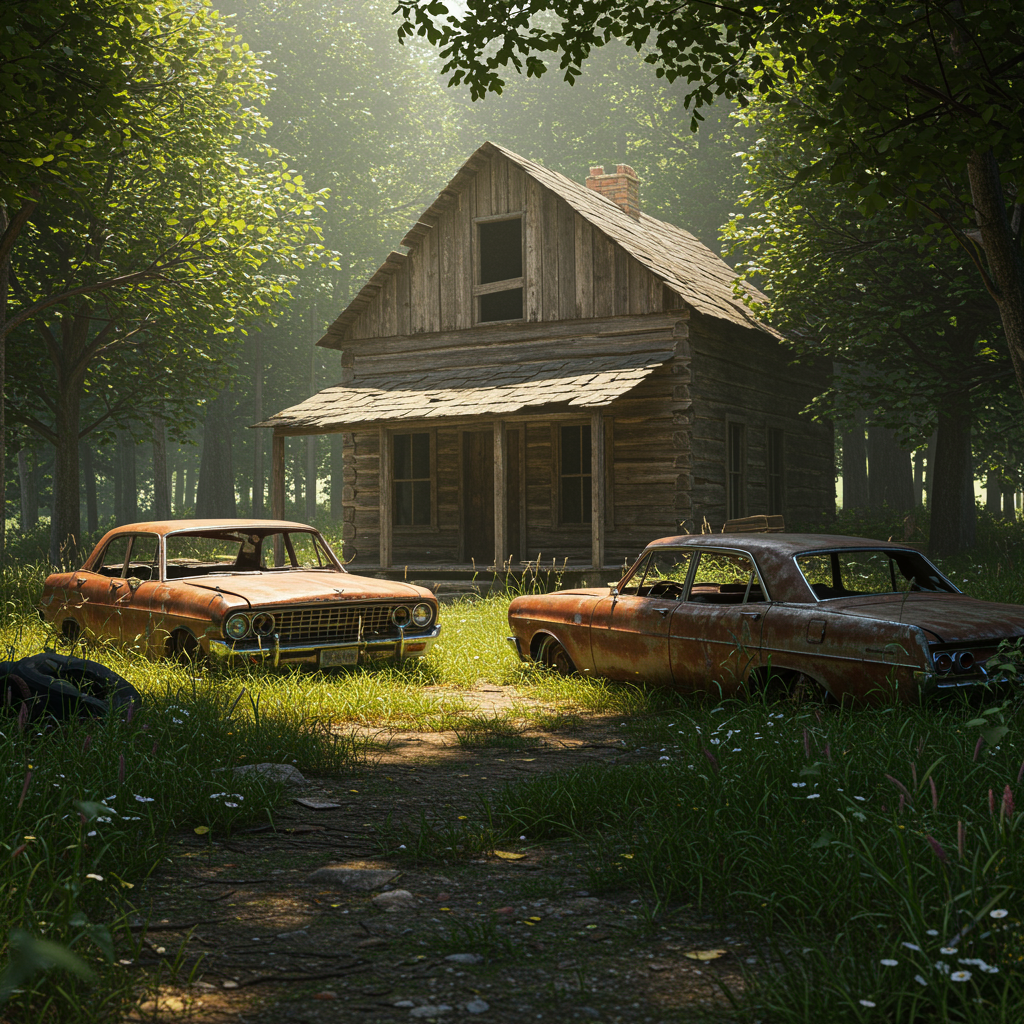 The scene depicts an aging, weathered log cabin nestled beside an overgrown dirt road, its wooden structure telling tales of a bygone era. A rusted, vintage car from the 1960s rests forlornly next to the cabin, its faded paint and worn-out tires adding to the air of abandonment. The surrounding yard is wild and untamed, with grasses and weeds overtaking any semblance of front lawn. Sunlight filters through the dense foliage overhead, casting dramatic shadows and lending a volumetric depth to the picture. The overall atmosphere is steeped in nostalgia and the passage of time, captured in ultra-realistic detail from a front view perspective.