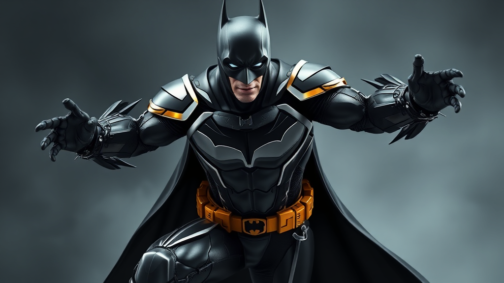 View this AI-generated image featuring a highly detailed depiction of a full body batman character showcasing photorealism and dynamic motion featuring an exquisitely armored luxury suit with striking white and gold chrome details contrasted against a matte black finish the pose is intended to be en